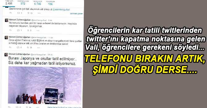 Geçtiğimiz hafta yoğun kar yağışı nedeniyle eğitime 5 Ocak gününe kadar arar verilirken, öğrenciler bugün yine ders başı yaptı. Ancak gençlerin tatil sevdası bir türlü bitmedi. Günlerdir kendisine twitter hesabından mesaj atan öğrencilerle bir bir ilgilenen ve sorularını yanıtlayan Vali Ahmet Zahteroğulları, bu kez örneklerle öğrencilerin karşısına çıktı. “Yine mi tatil yok” diyen bir öğrenciye yanıt veren Vali Zahteroğulları, “Önce eğitim! Tatile az kaldı! Eğitimi ve ulaşımı engelleyecek hava şartları olmadığı sürece tatil yok.tlf nu bırakın ve derslerinize bakın!” dedi.