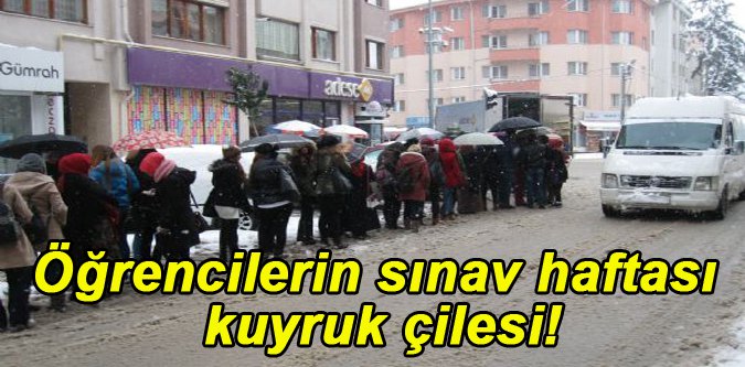 Buz kesen hava şartlarında derecelerin -5’leri gösterdiği şu günlerde üniversite öğrencilerine adeta işkence yaşatılıyor. Soğuk ve kar yağışlı havada şehrin çeşitli noktalarında otobüs bekleyen öğrenciler çok uzun kuyruklar oluşturuyor. Saatlerce kuyrukta bekleyen öğrenciler, kimi zaman ders saatini veya sınav saatini kaçırdıklarını belirterek; “Kuyrukta beklerken boşuna zaman kaybettiğimize mi yanalım. Yoksa soğuktan donduğumuza mı, ya da ders saatlerini veya sınav saatlerini kaçırdığımıza mı yanalım” diye sitem ettiler.Eksi 5 dereceye kadar düşen gündüzün dondurucu soğuğunda Tabaklar Mahallesi’ndeki Asmalı Durak’ta bekleyen 100’e yakın öğrencinin oluşturduğu uzayıp giden kuyruk, köşeyi dönerek Cumhuriyet Caddesi boyunca devam ediyor. Soğuk havada saatlerce otobüs bekleyen öğrencilerin kuyruk çilesi yürek dağlarken, yetkililerin bir an önce konuya çözüm bulması bekleniyor.