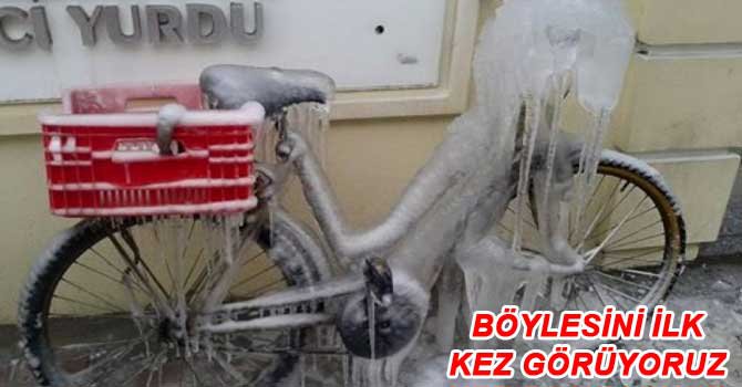 PTT Caddesi’nde bir vatandaşın dışarıda bıraktığı bisiklet sıfırın soğuk hava edeniyle dondu. Hava sıcaklığının sıfırın altında seyrettiği Bolu'da dışarıda bırakılan ve tamamen buz tutan bisiklet kış ayının şiddetini ortaya koydu. Dondurucu soğukların ilerleyen günlerde de devam edeceği ifade edildi.