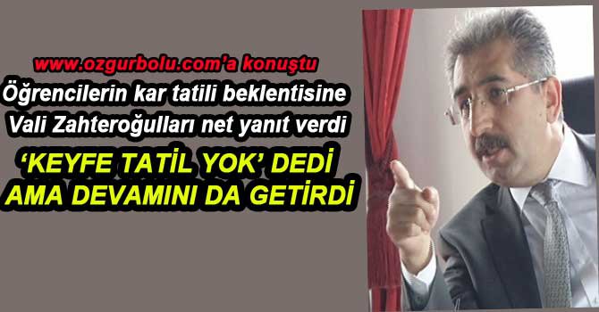 Kar yağışı Bolu kent merkezinde şiddetini artırırken, okulların tatil edilip edilmeyeceği merak edilirken, telefonla ulaştığımız Bolu Valisi Ahmet Zahteroğulları, “Şu anda kar yağışının duruma bakıyoruz. Öğrencilerimiz istedi diye hiçbir zaman tatil yapmadık. Çok sayıda öğrencimiz bir şekilde araçla okullarına ulaşıyor. Bekleyip ilerleyen saatler içinde kararımızı vereceğiz” diye konuştu.