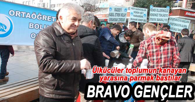 Ülkü Ocakları Bolu Şubesi Orta Öğretim Birimi Başkanlığı tarafından uyuşturucu madde bonzaiye dikkat çekmek için Cuma namazı sonrasında “Bonzai içme çay iç” sloganıyla camiden çıkan vatandaşlara çay ikram edildi.