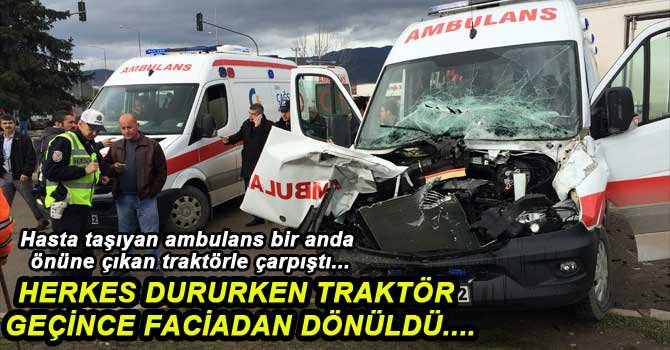Sanayi Kavşağı’nda, hasta taşıyan ambulans bir anda yola çıkan traktörle çarpışırken, kazada 2 kişi yaralandı.