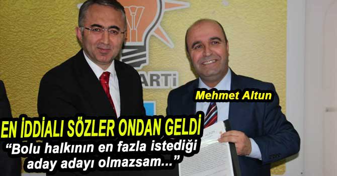 Tarım, Gıda ve Hayvancılık İl eski Müdürü ve Abant TV'nin sahibi Mehmet Altun, AK Parti'den milletvekili aday adayı oldu. Parti binasında başvuru dosyasını teslim eden Altun, “Bolu kamuoyu tarafından en çok istenen bir aday olmayacaksam ben bu seçimlerde aday olmayı düşünmüyorum. Bolu halkının bu görevi bize tevdi etmesi lazım” dedi.