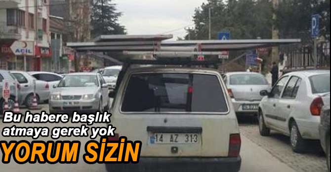 Hastane Caddesinde çekilen fotoğrafta bir otomobilin üzerine konulan pencere doğraması görümündeki yük, aracı hem enine hem boyuna genişleterek, iki araçlık bir genişlikte caddeye yayılmış vaziyette hiçbir güvenlik önlemi alınmaksızın trafikte ilerleyerek yürüdü gitti.
