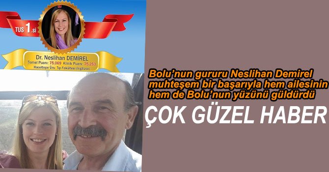 Bolu’nun emektar öğretmenlerinden, Boluspor eski menajeri ve köşe yazarı Muharrem Demirel’in kızı Dr. Neslihan Demirel, 2015 İlkbahar dönemi TUS (Tıpta Uzmanlık Sınavı) sınavında Türkiye birincisi olarak Bolu’nun gururu oldu.