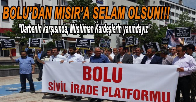 Ak Parti Bolu Milletvekili Ali Ercoşkun’un da katılarak destek verdiği protesto yürüyüşünde, “ Mısır’da darbenin karşısında, Müslüman Kardeşlerin yanındayız”, “ Ya bu adamlar durur, ya mazlumların ahı Batı’yı vurur”, “ İhvan’a selam, direnişe devam “ şeklinde sloganlar atılırken, platform adına konuşan Memur Sen Bolu İl Temsilcisi Ahmet Koçak, gruptan hiçbir siyasi slogan atmamaları konusunda ricada bulundu. Koçak, yaptığı açıklamada şunları ifade etti; “Mursi’nin ilkeli ve tavizsiz tutumu karşısında acziyet içine düşenler, bugün Muhammed Mursi’yi, darbe karşıtlarını nasıl ve niçin yargıladıklarını hiç kimseye anlatamazken Batı bu zulme ortak oluyor. Mısır’daki meşru hükümetin darbe yoluyla iktidardan uzaklaştırılmasına sessiz kalan dünyanın bugün yeni katliamlara kapı araladığını, ilkesel temelde kararlı bir duruş sergilemediklerinden darbecilerin zulmü bir adım daha öteye götürmeye çalıştıklarını görüyoruz. On hukuksuz karar ve Batı’nın sessizliği dünya sisteminin nasıl adaletsiz olduğuna ışık tuttu. Haksız hukuksuz kararlar karşısında sessiz kalan, darbecilere örtülü ve açık destek veren emperyalizmin kanlı yüzünü bir kez daha deşifre etti. Batının sadece kirli yüzü değil; doğasındaki küfrü de bir kez daha ortaya çıktı. Bunlar Sisi sever. Bunlar kan içici vampirler. Bunlar tüm değerlerimize savaş açan kapitalist cinayet şebekesi. Hepsini kınıyor, lanetliyoruz. Sahte demokrasi de, insan hakları anlayışları da yere batsın. Öte yandan; İran, Suudi Arabistan, Katar, Birleşik Arap Emirlikleri, Körfezin baronları ve tüm Ortadoğu ülkeleri bu zulme seyirci kalırsa üç maymunu oynamaya devam ederse tarih bunu da affetmeyecektir." dedi.