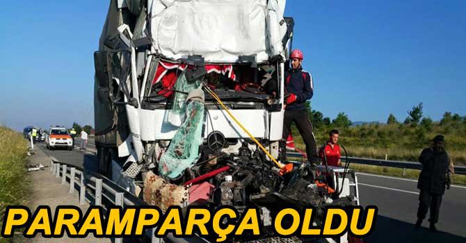 Bolu’da iki TIR’ın çarpışması sonrasında meydana gelen trafik kazasında 1 kişi hayatını kaybetti. Kaza da TIR’ın çekicisi çarpmanın etkisiyle paramparça oldu.