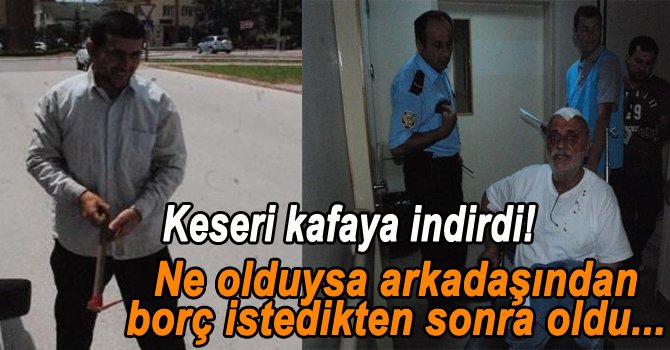 Edinilen bilgiye göre, olay öğle saatlerinde Karaçayır Mahallesi’nde meydana geldi. Habib U. bir süredir kendisinden borç isteyen Melih Ü.’nün telefonlarını açmıyordu. Melih Ü. ile Karaçayır Mahallesi’nde karşılaşan Habib U. aralarında çıkan tartışma sonucu otomobilinde bulunan keserle Melih Ü’nün kafasına vurdu. Kafasından yaralanan Melih Ü. 112 Acil Servis ekiplerince hastaneye kaldırılırken, Habib U. olaydan yaklaşık yarım saat sonra Keserle birlikte İzzet Baysal Devlet Hastanesi’ne geldi. Hastane polisine durumu anlatarak teslim olan Habib U. gözaltına alınırken, Melih Ü’nün tedavisi devam ediyor.
