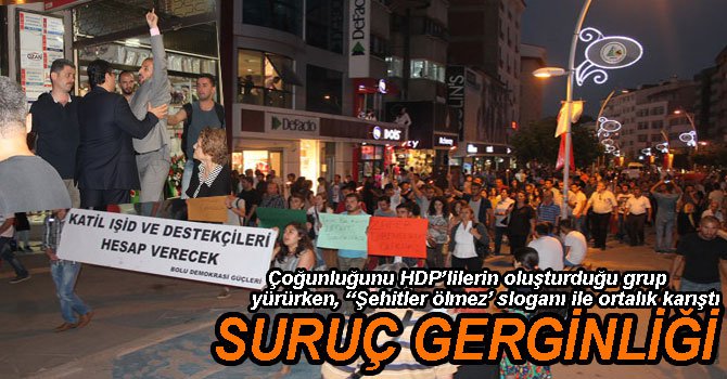 Şanlıurfa’nın Suruç ilçesinde 32 kişinin öldüğü 100 kişinin yaralandığı patlama Bolu’da çoğunluğunu HDP’lilerin oluşturduğu 100 kişi tarafından yürüyüşle protesto edildi. Yürüyüş sırasında BBP İl Başkanı Mahmut Alan, yürüyüş yapan gruba, “Şehitler ölmez vatan bölünmez” diye bağırdı. Polis\ Alan’ı olay yerinden uzaklaştırdı.