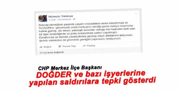Hüseyin Yıkılmaz, sosyal paylaşım sitesi Facebook’taki kişisel sayfasında, “Bolu'da ekmeğinin peşinde, yaşam mücadelesi veren esnafımıza ve DOĞDER'e, şehrimizde yerel medyanın verdiği gazla medya maymunu haline gelmiş, ölü sevici, patolojik sorunları olduğu her halinden belli olan bir tipin önderliğinde ve polis nezaretinde saldırı yapılmıştır. Esnafımıza ve dernek yöneticilerine geçmiş olsun dileklerimi iletiyorum. Şehrin valisinden de görevinin gereğini yapmasını bekliyorum” ifadelerini kullandı.