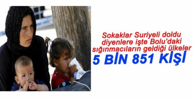Bolu Valiliği'nden alınan bilgiye göre, 1 Ekim 2015 tarihi itibarıyla Bolu'da, 4 bin 77'si Irak, 459'u Suriye, 243'ü Afganistan, 178'i İran, 120'si Kırgızistan, 66'sıMoğolistan, 45'i Azerbaycan, 40'ı Gürcistan, 35'iKazakistan, 37'si Suudi Arabistan ve 551'i de diğer ülkeler olmak üzere toplam 5 bin 851 yabancı uyruklu vatandaş ikamet ediyor.