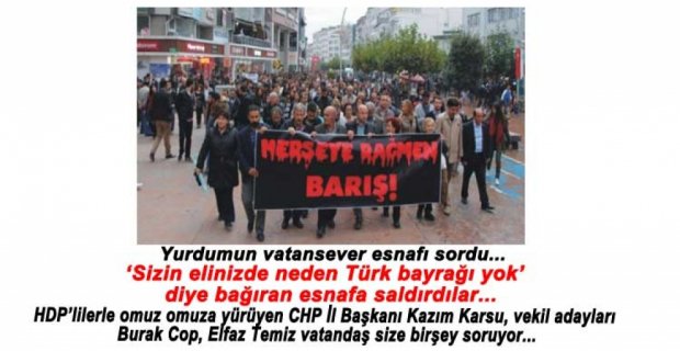 Elınde neden türk bayrağı yok diyen esnafa saldıracak kadar haysiyetsiz bir tutumda olanlarla CHP yöneticilerinin ne işi vardı.Evet herşeye ragmen barış deseydinizde ellerinizde türk bayraklarıyla gezseydiniz.Atatürkçü bir genç olarak utanıyorum.