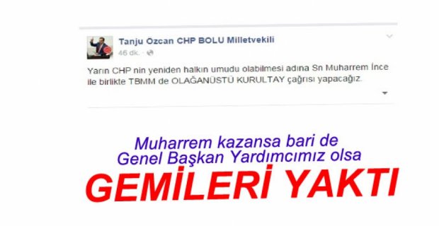 Tanju Özcan, twitter hesabından, “Yarın CHP’nin yeniden halkın umudu olabilmesi adına Sn Muharrem İnce ile birlikte TBMM de olağanüstü kurultay çağrısı yapacağız” dedi.