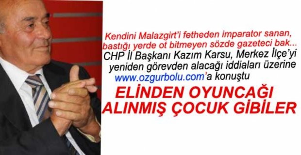 Merkez İlçe Yönetimini elinden oyuncağı alınmış çocuğa benzeten ve Milletvekili Tanju Özcan'ın da bu yönetimi destekler tavrının yanlış olduğunu belirten Kazım Karsu, "Yönetmeliği incelerseniz görürsünüz. Ben size şuanda hepsini sayamam. Bunlar elinden oyuncağı alınmış çocuk gibi heyecanlanıyorlar. İşlerine geldiği gibi davranıyorlar. İnatla göreve devam etme diye birşey olmaz. İnatlaşmak bizim işimiz değil. Onlar kendi kendilerini ikna ederler diye düşünüyorum. İtiraz mercii bellidir. Tanju Bey de zaten onları destekler bir görünümdedir. Yanlış yapıyorlar. Keskin sirke küpüne zarar" ifadelerini kullandı.