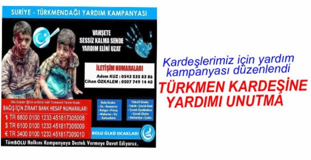 Ülkü Ocakları Bolu İl Başkanı Adem Evcil, “Suriye Türkleri, Selçuklu sultanı Alparslan'ın Malazgirt Savaşı'ndan önce belirli oranlarda Rakka ve Halep bölgesine yerleşmeye başlayan ardından Anadolu'nun fethiyle bölgeye genel anlamda yerleşmeye başlayan Haçlı Seferlerine karşı önemle yerleştirilmiş Oğuz boylarıdır. Suriye’deki nüfusları 1.500.000 civarındadır. G20 zirvesinin hemen ardından Esad rejimi tarafından Türkmen kardeşlerimize karşı saldırılar en üst düzeye çıkartılmıştır. Esad Daeş terörünü bir tarafa bırakmış Türkmen soydaşlarımıza karşı katliama başlamıştır. Büyük kürdistanın karşısında en büyük engel olan Türkmenler büyük bir soykırımla karşı karşıyadır. Filistin’e, Mısır’a dualar eden, rabia işaretleri ile ortalığı kasıp kavuran hükümet bu katliama bir an önce dur demelidir. İslamiyetle Sıla-i rahim kavramı vardır. Bu kavrama göre yardıma ilk önce kardeşlerden başlamaktadır. Ey hükümet kardeşlerimizin, soydaşlarımızın yanında olmak sizin namus ve şeref borcunuzdur. Namazda bile sırtımızı Türkiye'ye, yüzümüzü Kıbleye dönüyoruz diyen mücahitlere sahip çıkalım. Eğer kardeşlerimizi yakan ateşe karınca misali su taşımazsak ahrette bizim vay halimize” dedi. Haber Merkezi