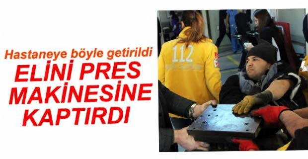 Alüminyum fabrikasında çalışan Mustafa Mısırlı’nın elini pres makinesine kaptırdı. Eline saplanan metal parçalar nedeniyle Mısırlı hastaneye elinin saplı kaldığı kalıpla birlikte götürüldü.