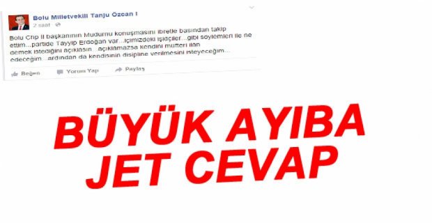 Tanju Özcan sosyal medyadan yaptığı açıklamada, “Bolu Chp İl başkanının Mudurnu konuşmasını ibretle basından takip ettim…partide Tayyip Erdoğan var…içimizdeki işidçiler…gibi söylemleri ile ne demek istediğini açıklasın…açıklamazsa kendini müfteri ilan edeceğim…ardından da kendisinin disipline verilmesini isteyeceğim” dedi.