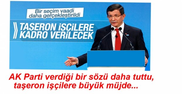 Başbakan Davutoğlu, kamuda çalışan tüm taşeron işçilere kadro verildiğini açıkladı. Başbakan, "Sizlerle bir müjdemizi Bakanlar Kurulu'nda aldığımız kararı sizlerle paylaşmak istiyoruz. Seçim vaatlerimizde asıl işlerde çalışanları kamuya alacağımızı söylemiştik çalışmalarımızı tamamladık asıl işlerde çalışan personelimizi kamuya alıyoruz. Dışarda kalan tek taşeron işçisi kalmayacak inşallah" dedi.