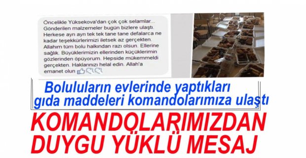 Komandolarımız yazdıkları notta “Öncelikle Yüksekova’dan çok çok selamlar… Gönderilen malzemeler bugün elimize ulaştı. Herkese ayrı ayrı, tek tek, tane tane, defalarca ne kadar teşekkürlerimizi iletsek az gerçekten. Allah’ım tüm Bolu halkından razı olsun. Ellerine sağlık. Büyüklerimizin ellerinden, küçüklerimizin gözlerinden öpüyoruz. Hepsi de mükemmeldi gerçekten. Haklarınızı helal edin. Allah’a emanet olun” ifadelerini kullandılar.