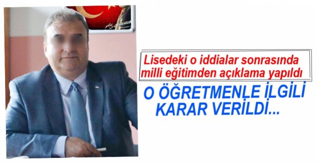 Bolu Milli Eğitim Müdürlüğü’nden yazpılan yazılı açıklamada, “İlimiz Bolu Anadolu Güzel Sanatlar Lisesinde görev yapan öğretmenle ilgili olarak, Müdürlüğümüz tarafından 18.04.2016 tarihinde işlem başlatılmış, Valilik oluruyla da 19.04.2016 tarihinde görevinden uzaklaştırılmıştır. İlimiz Maarif Müfettişleri tarafından soruşturma yürütülmektedir” denildi.