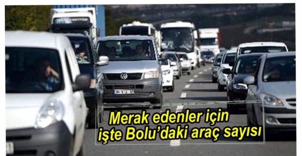 Bolu Valisi Aydın Baruş’un açıklamalarına göre, Bolu’da 2016 Şubat ayı itibarıyla trafiğe kayıtlı araç sayısı 102 bin 731. Bu araçların, 49 bin 421'i otomobil, bin 416'sı minibüs, bin 016'sı otobüs, 14 bin 578'i kamyonet, 5 bin 602'si kamyon, 10 bin 377'si motosiklet, 19 bin 977'si traktör ve 344'ü özel amaçlı araçlardır.
