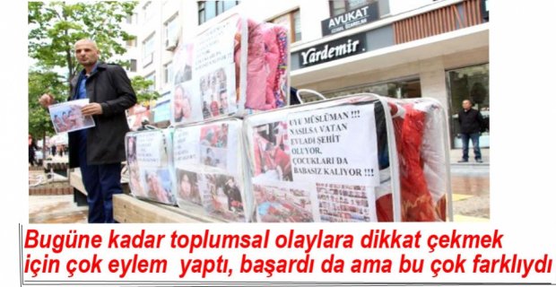 Mardin'in Nusaybin İlçesi'nde PKK'lı teröristlerin güvenlik güçleri tarafından teslim alınma görüntüleri ve şehitlere sessiz kalınmasını BBP eski İl Başkanı Mahmut Alan ilginç bir eylemle protesto etti. İzzet Baysal Caddesi'nde üzerinde şehitlerin fotoğrafları ile 'Uyu Müslüman nasılsa vatan evladı şehit oluyor. Çocukları da babasız kalıyor' yazılı uyku setlerini sıralayan Alan, elinde teslim olan PKK'lıların fotoğraflarıyla 'Uyu Müslüman uyu, alın size benden bedava uyku seti' diyerek bağırdı. Alan'ın eylemini caddeden geçen vatandaşlarda meraklı bakışlarla izledi. Alan'ın bedavaya dağıttığı uyku setlerini kimse almadı.