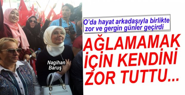 Bolu Valisi Aydın Baruş’un eşi Nagihan Baruş, Demokrasi ve Şehitler Mitingi’nde duydu dolu anlar yaşadı. 15 Temmuz’dan bu yana hayat arkadaşıyla birlikte zor ve yorucu günler geçiren Nagihan Baruş, bütün konuşmacıları çok dinledi fakat eşinin konuşmasını dinlerken ağlamamak için kendini zor tuttu.