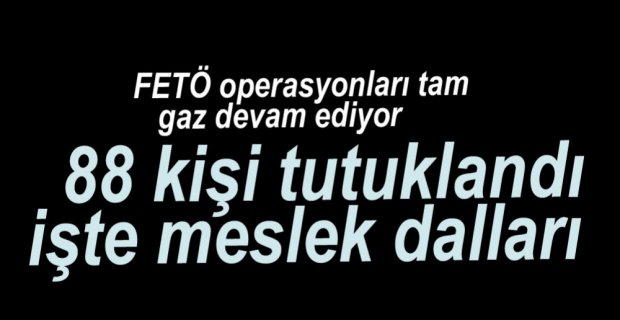 Edinilen bilgiye göre, 26 gün önce FETÖ’ya bağlı subayların darbe girişimi sonrasında örgüte yönelik başlatılan operasyonlar devam ederken, savcılık talimatıyla gözaltına alındıktan sonra tutuklananların sayısı 88’e ulaştı. Bolu il genelinde 2 Vali Yardımcısı, 3 asker, 11 polis, 15 öğretim görevlisi, 15 hakim savcı ve diğer mesleklerden 42 kişi olmak üzere toplamda 88 kişi tutuklandı.