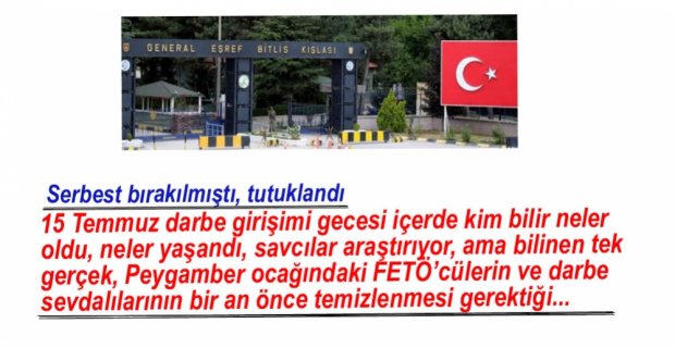 Edinilen bilgiye göre, Bolu Cumhuriyet Başsavcılığı talimatıyla geçtiğimiz hafta Bolu Emniyet Müdürlüğü Terörle Mücadele Şubesi ekipleri tarafından gözaltına alınan ve adli kontrol şartıyla serbest bırakılan Bolu Komando Tugay Komutanlığında görevli Üsteğmen M.G. hakkında yeniden gözaltı kararı çıkartıldı. M.G, çıkarıldığı mahkeme tarafından tutuklanarak cezaevine gönderildi.