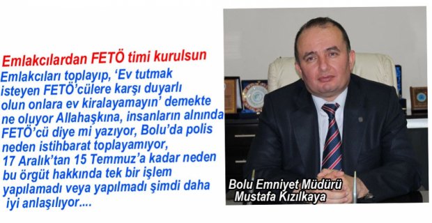 Bolu İl Emniyet Müdürü Mustafa Kızılkaya, emlakçıları Fetullahçı Terör Örgütü (FETÖ) konusunda uyardı. Kızılkaya, “Biz kimseye suçlu demiyoruz ama eğer FETÖ öğrenciler için ev bakacaksa mutlaka sizlere gelecektir. Bunu biliyoruz. Dolayısıyla sizlerin bu konuda biraz daha dikkatli, uyanık olmanız ve bu konuya öncelik vermeniz birçok şeyi kolaylaştıracaktır” dedi.