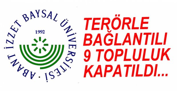 Abant İzzet Baysal Üniversitesi Rektörlüğü tarafından terör örgütleriyle ilişkisi bulunduğu veya sempatizanlığını yaptığı iddiasıyla 9 adet öğrenci topluluğunun kapatıldı.