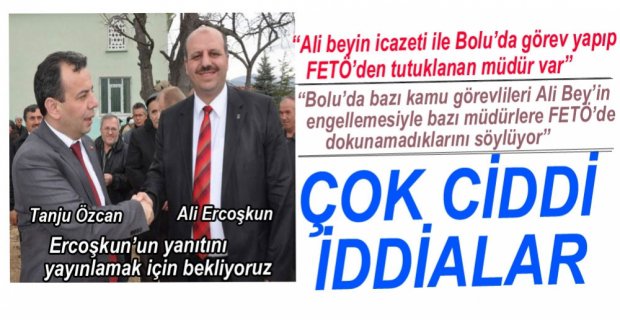 CHP Bolu Milletvekili Tanju Özcan, “Ali Ercoşkun bey’in icazetiyle Bolu’ya gelip müdür olan, FETÖ operasyonunda kuvvetli suç şüphesi ile tutuklananlar var. Ali Bey bunların hesabını verecek. Bolu’da bazı kamu görevlileri Ali Bey’in engellemesi ile bazı müdürlere dokunamadıklarını söylüyor, bunu herkes biliyor” iddiasında bulundu. Özcan iddialarının devamında, “Bolu’daki FETÖ operasyonların, özellikle yukarı doğru giden operasyonların, önünden arkasından hep Ali Bey çıkıyor. Nasıl oluyor bu iş. Bunları hepsini Sayın Cumhurbaşkanı bilmesi gerekiyor” şeklinde konuştu.