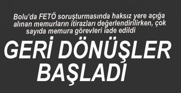 Açığa alınan memurlar hakkında yapılan incelemelerde tamamlanmaya başladı. Haklarında terör örgütüyle bağlantı bulunmadığı tespit edilen 69 memurun görevlerine döndükleri ifade edildi. Yapılan açıklamada görevleri iade edilen memurların 56’sının öğretmen, 4’ünün Bolu Valiliği personeli ve 9’unun da diğer kurumlarda görevli oldukları belirtildi.