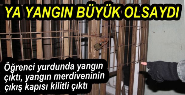 Bolu’da 125 erkek öğrencinin kaldığı yurdun çamaşırhane bölümünde çıkan yangın öğrenciler tarafından söndürülürken, yurdun yangın merdiven çıkış kapısı kapalı olunca öğrenciler isyan etti. Akıllara Adana’nın Aladağ ilçesinde bir hafta önce meydana gelen ve 11 öğrenci ve 1 eğitmenin hayatını kaybettiği yurt yangını geldi. Adana'da yangın merdiven çıkış kapısı kilitli olduğu için öğrenciler yanarak can vermişlerdi.