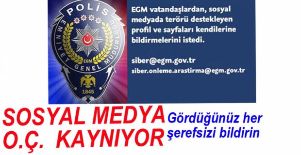 Emniyet Genel Müdürlüğü, vatandaşlardan, sosyal medya üzerinden terör faaliyetlerini destekleyen ve suç unsurları içeren profil ve sayfaları kendilerine bildirmelerini istedi.