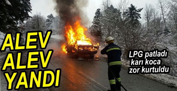 Bolu’da içinde iki kişinin olduğu otomobil seyir halindeyken LPG’sinin patlaması sonrasında alev alev yandı.