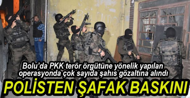 Edinilen bilgiye göre, Bolu Emniyet Müdürlüğü Terörle Mücadele ekiplerinin PKK terör örgütüne yönelik başlattığı operasyonda Polis Özel Harekat polislerinin de desteğiyle sabah saatlerinde çok sayıda ve işyerine baskın düzenlendi. Baskınlarda PKK terör örgütünün propagandasını yaptıkları gerekçesiyle M.K., H.K., R.D.Ö., F.S., D.K., Ş.C VE D.K isimli şahıslar gözaltına alındı. Şahıslar ifadeleri alınmak üzere Bolu Emniyet Müdürlüğüne götürülürken, ev ve işyerlerindeki çok sayıda evrak dökumana konuldu. Operasyonla ilgili incelemenin genişleyerek devam edeceği ifade edildi.