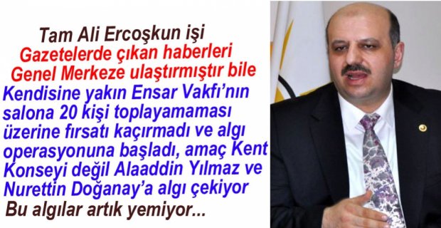 AK Parti Bolu Milletvekili Ali Ercoşkun, birbirinden ünlü siyasetçi, bürokrat ve akademisyen isimlerin katılımıyla, Bolu'da sivil toplum kuruluşları ve vatandaşlara Anayasa değişikliğinin anlatıldığı ve müzakere edildiği panelin organizasyon teklifini reddeden Kent Konseyi'ne sert eleştirilerde bulundu. Kent Konseyi’nin toplantının organizasyonunu kabul etmemesi üzerine kendisine yakınlığıyla bilinen Ensar Vakfı’nın salona az sayıda kişiyi getirmesiyle Ali Ercoşkun Kent Konseyi üzerinden Bolu Belediye Başkanı Alaaddin Yılmaz ve AK Parti İl Başkanı Nurettin Doğanay'ın üzerine algı yapmaya başladı. Ercoşkun bu açıklamayla topu kendisinden atmaya çalıştı.