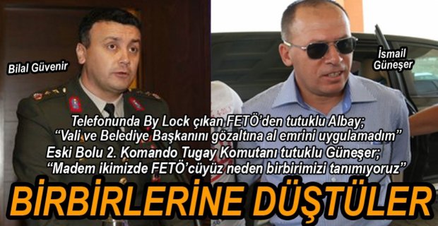 Bolu'da, FETÖ/PDY soruşturmaları kapsamında 3'ü tutuklu 10 askerin yargılandığı davada tanık olarak dinlenen, telefonunda By Lock çıkan ve FETÖ'den tutuklu Düzce İl Jandarma Komutanı Bilal Güvenilir'in, eski Bolu 2. Komando Tugay Komutanı İsmail Güneşer'den, "vali, belediye başkanı ve emniyet müdürünü görevden al" emrini aldığını fakat yerine getirmediğini belirtmesi üzerine Güneşer, "madem ikimiz de FETÖ'cüyüz, nasıl birbirimimizi tanımıyoruz ve ben onun üstüyken nasıl emrimi uygulamadı" dedi.