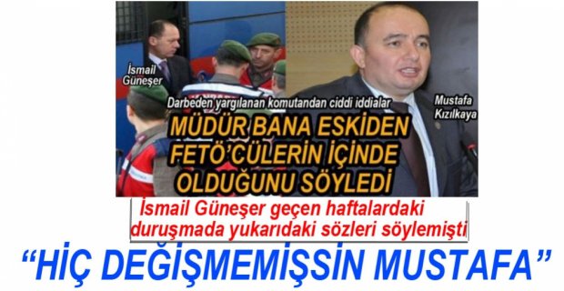 15 Temmuz gecesi İsmail Güneşer ile 2 kez telefon görüşmesi yaptığını ve bu görüşmelerde Güneşer'in, "ben sıkıyönetim komutanıyım" gibi bir ifade de bulunmadığını belirten Kızılkaya'ya, İsmail Güneşer, "teşekkür ediyorum Mustafa. Hiç değişmemişsin" dedi.