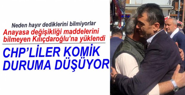 AK Parti Bolu İl Başkanı Nurettin Doğanay, “CHP Genel Başkanı Kemal Kılıçdaroğlu ve CHP yöneticileri 16 Nisan'da yapılacak referandumda değişecek 18 maddeyi ve Cumhurbaşkanlığı Hükümet Sistemi hakkında bilgisi yok. CHP'lilerin bu halleriyle komik duruma düşüyor” dedi.