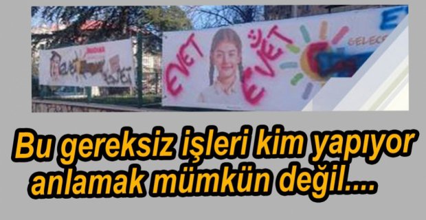 Bolu'nun Mengen İlçesi'nde CHP'nin astığı 'hayır' afişi, ikinci kez tahrip edildi. 'Hayır' yazıları sprey ile boyanan afişe 'evet' yazıldı.