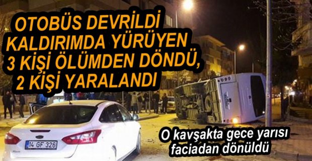 Bolu’da gece saatlerinde Beşkavaklar Mahallesi ile Bahçelievler Mahallesi’ni birbirine bağlayan kavşakta servis otobüsü ile otomobilin çarpışması sonrasında meydana gelen trafik kazası sonrasında otobüs devrildi. Kazada 2 kişi yaralanırken, kaldırımda yürüyen 3 kişi de ölümden döndü.