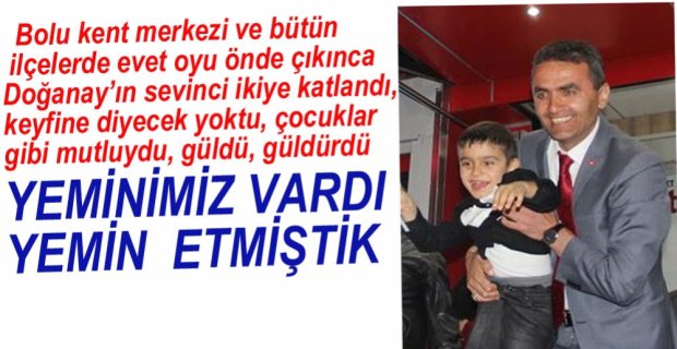 Referandum sonrası Bolu’dan %62 oranında Evet oyunun çıkmasının ardından Ak Parti İl Başkanı Nurettin Doğanay, Bolululara teşekkür etti. 15 Temmuz Demokrasi Meydanı’nda Bolululara seslenen Doğanay, “Türkiye’nin kaderini değiştiren geceye şahitlik ediyorsunuz. Allah hepinizden razı olsun. Bolu şahitlik ediyor, yeminiz vardı. Yemin etmiştik. Koca reis seni başkan yapacağız demiştik. Bolu öncelikle üzerine düşen görevi yerine getirdi. Onun için diyorum ki Göynük, Seben, Mudurnu, Kıbrıscık, Karacasu, Gökçesu, Mengen, Pazarköy, Dörtdivan, Gerede, Yeniçağa, Taşkesti ve Karasu’da yaşayanlardan rabbim razı olsun. Sizler öncelikle 15 yıldır durmadan, dinlenmeden Ak Parti davasına sahip çıktınız. Bu günde Bolu üzerine düşeni yaptı ve yine sahip çıktı. Köroğlu’nun diyarından %62 ile evet dediniz. 15 Temmuz gecesi bu meydanda 27 gün bekleyen Bolulu hemşerilerimiz, bu yine bu meydan siz varsınız” dedi.