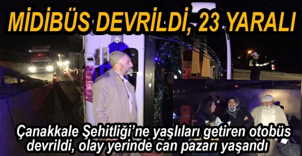 Bolu TEM otoyolunda midibüsün devrilmesi sonrasında meydana gelen trafik kazasında 23 kişi yaralandı. Olay yerinde can pazarı yaşandı, sağlık ekipleri yaralı vatandaşlar için seferber oldu. Minibüsteki yolcuların yaşlı vatandaşlar olduğu ve Çanakkale Şehitliğine ziyarete gittikleri öğrenildi.