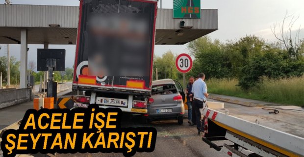 Düzce'nin Gölyaka ilçesi TEM Otoyolu gişelerinde OGS kullanan kadın sürücü HGS gişesine girmeye çalıştı. Son anda HGS gişesinde olduğunu fark eden sürücünün diğer gişeye yönelmesi ile otomobili, aynı gişeye giren tır ile turnike arasında sıkıştı.