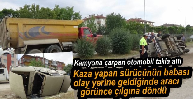 Bolu’da kamyona çarptıktan sonra takla atarak yan yola uçan aracın sürücüsü kazadan yaralı kurtuldu. Oğlunun kaza yaptığını öğrenen baba, olay yerine geldiğinde otomobilin hurdaya döndüğünü görünce sinirlenerek kamyon şoförü Yusuf Topçu ve beraberindekilerle tartıştı.