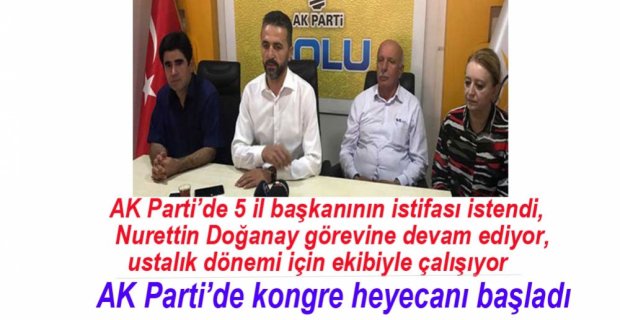 AK Parti Bolu İl Başkanı Nurettin Doğanay, genel merkezin onayının ardından 26 Ağustos’ta kongreleri yapmaya başlayacaklarını söyledi. Diğer yandan 5 il başkanının istifasını istendiği belirtilirken, kongrelerde görevdeki başkanlarla devam edileceği öğrenildi.