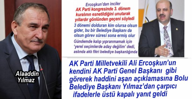Bolu Belediye Başkanı Alaaddin Yılmaz, AK Parti Bolu Milletvekili Ali Ercoşkun’un, “3. dönem kuralını dolduran kim olursa olsun görev süresi biter. Örneğin bu bir Belediye Başkanı ise onun da görev süresi dolmuş olur” şeklinde açıklamalarına üstü kapalı isim vermeden cevap verdi.