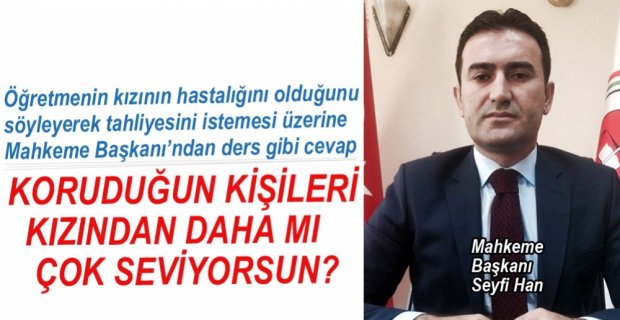 Bolu’da FETÖ/PDY davaları devam ederken, Mahkeme Başkanı Seyfi Han, tutuklu bir öğretmenin kızının hastalığı olduğunu ve acil olarak hastaneye götürmesi gerektiğini ifade ederek serbest bırakılmasını istemesi üzerine, “Kızının durumuna inan senin kadar üzüldüm. Etkin Pişmanlık Yasasını biliyorsun. Hala geç kalmış sayılmazsın. Hakkındaki iddialar ortada. Bylock kullandığın iddia ediliyor. İçinde bulunduğun durum nedeniyle birazda kendine bak. Koruduğun kişileri, kızından çok mu seviyorsun?” dedi.